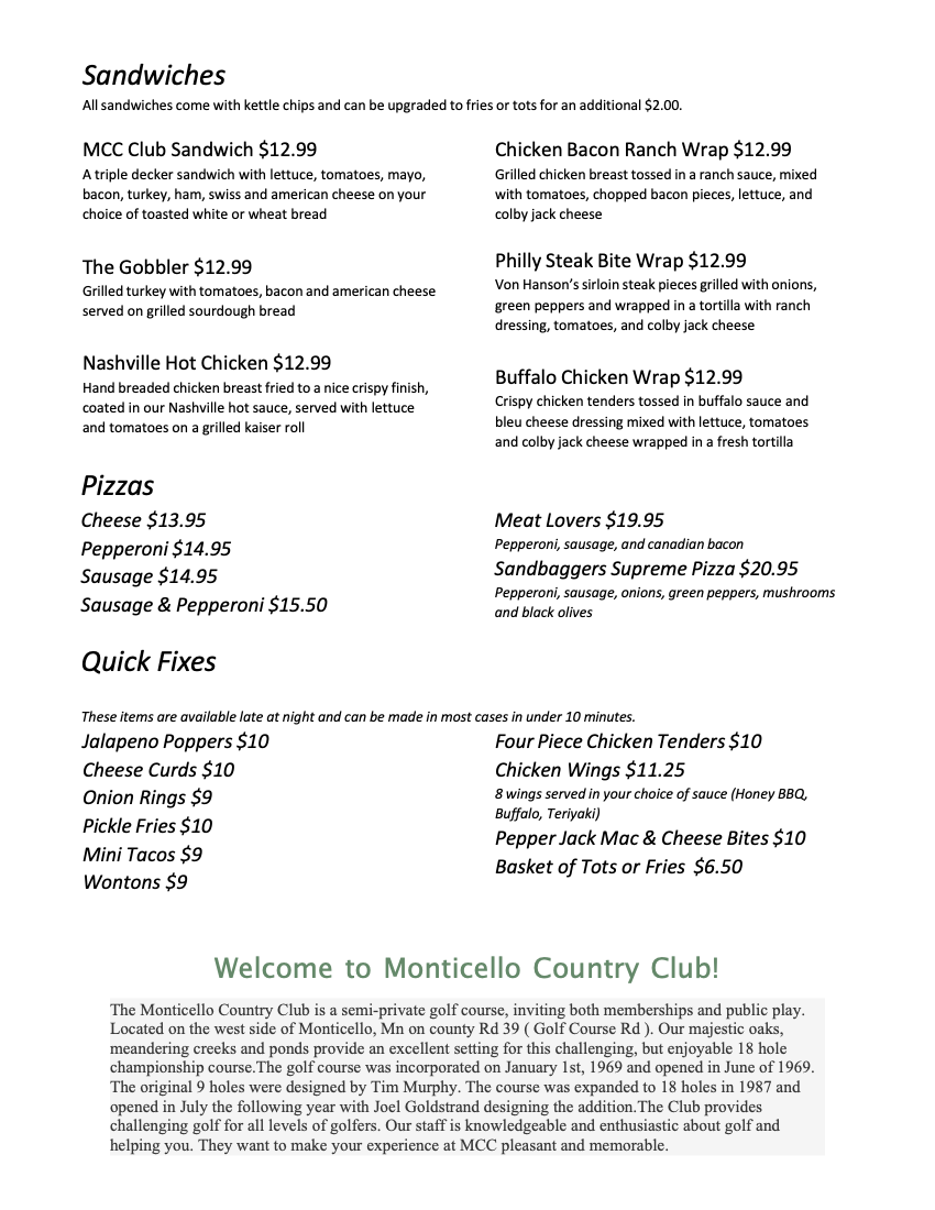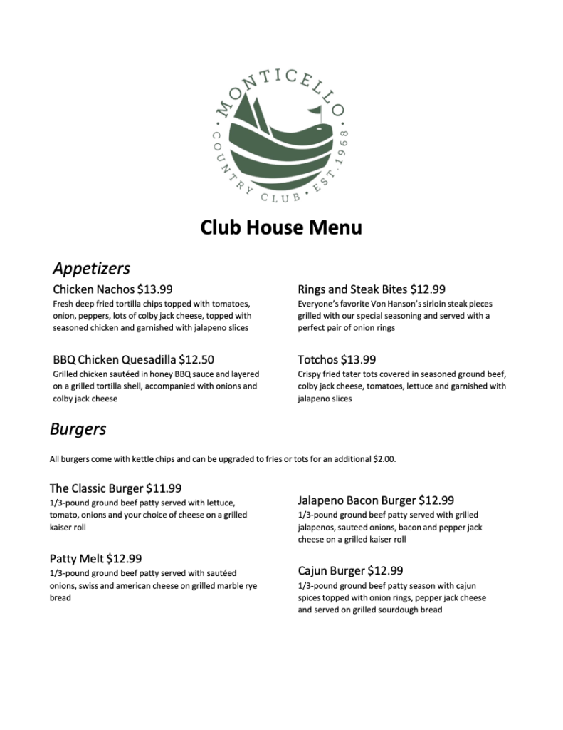 Welcome to your dining experience at Monticello Country Club. Make sure you check back to see all current promotions and weekly specials.